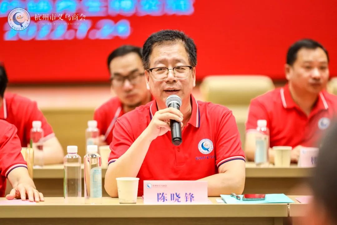 杭州市义乌商会会长、浙江科发资本管理有限公司董事长陈晓锋讲话,鼓励会员向童四鹤名誉会长学习,要永葆信念和信心,执着于事业,与时代共舞,思索在前沿,搏击在浪尖,用创新之举来推动义商事业的发展。