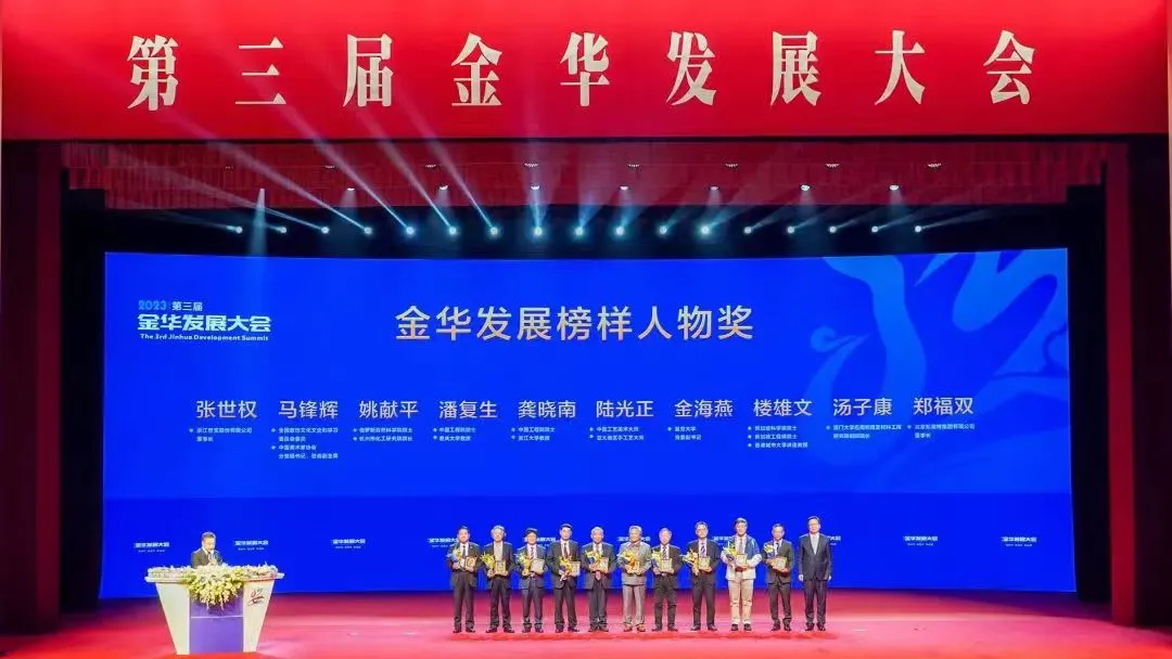 在会上,杭州市义乌商会常务副会长单位浙江世宝股份有限公司董事长张世权被授予“金华发展榜样人物奖”。