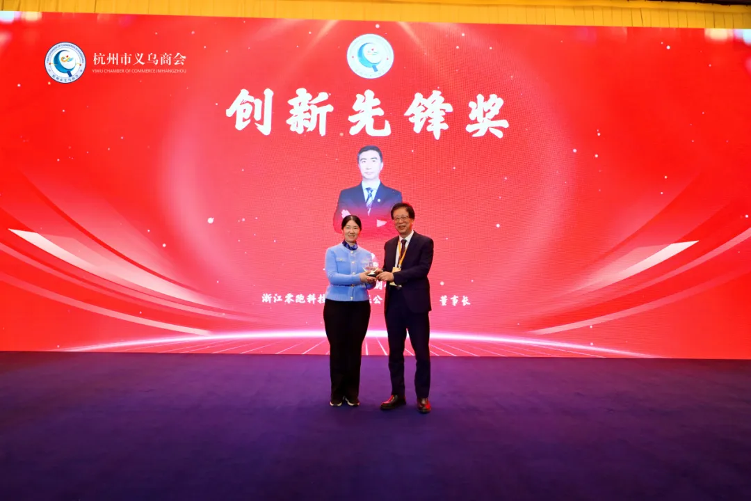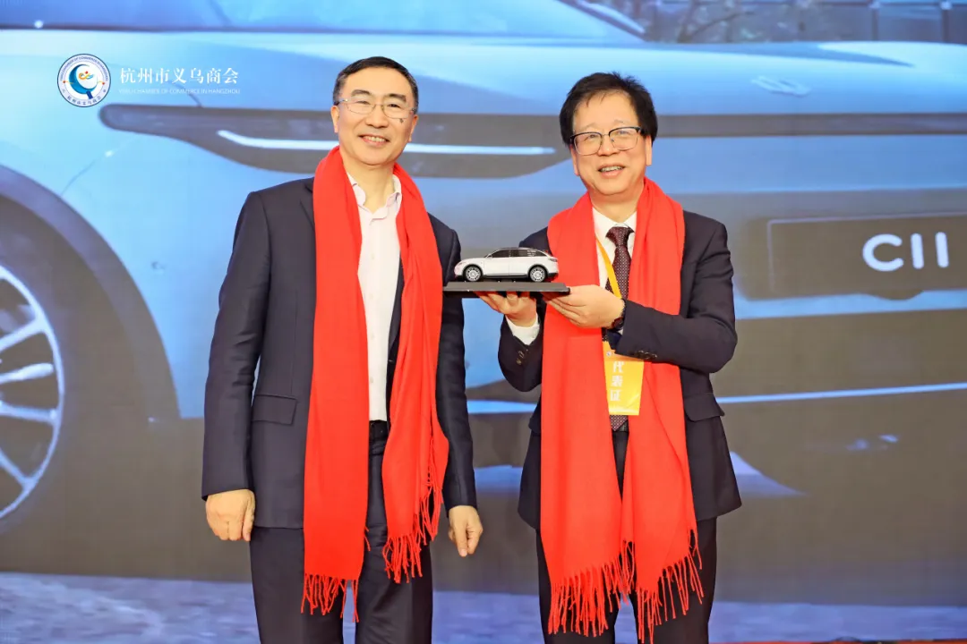 商会会长陈晓锋为创新先锋奖获得者浙江零跑科技股份有限公司创始人、董事长朱江明颁奖。义乌乡贤、浙江大华股份科技有限公司党委副书记、副总裁王颖代为领奖。