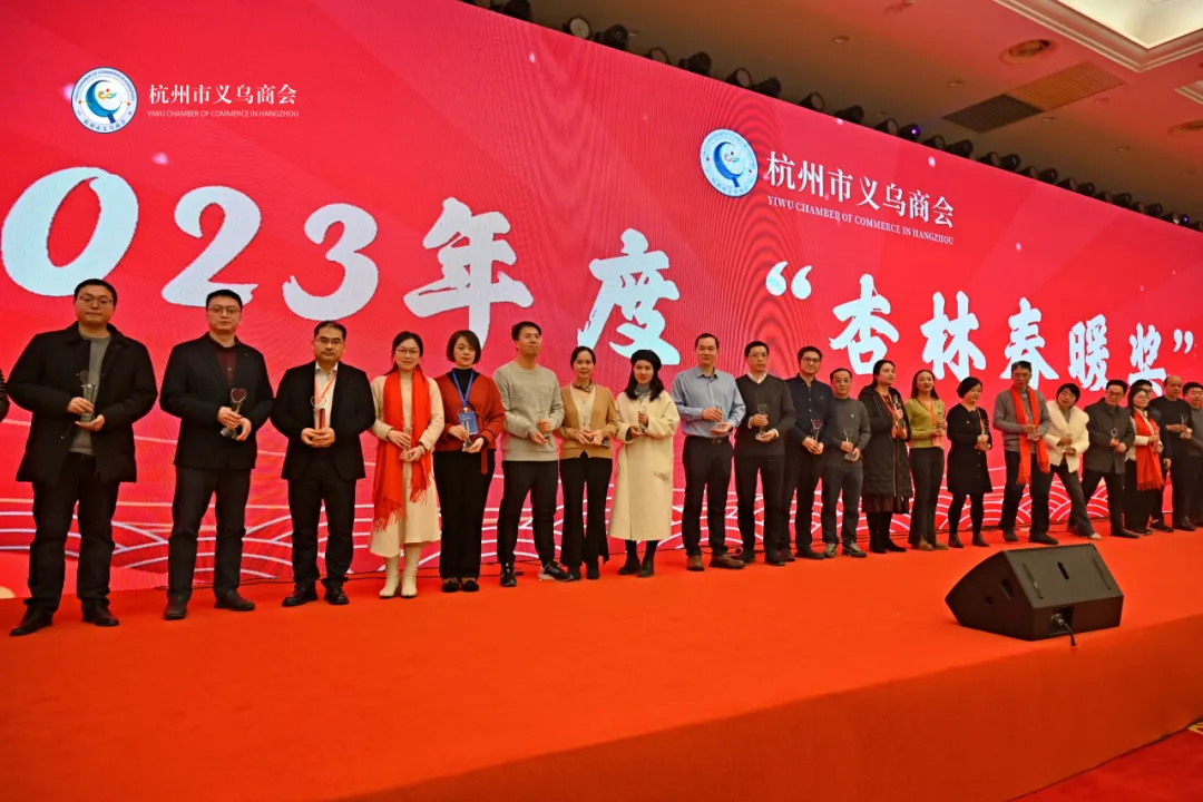 晚会期间,为了感谢健康专委会的支持,根据推荐与评选,杭州市义乌商会还进行了 2023 年度“杏林春暖奖”颁奖仪式。商会常务副会长、健康委副主任朱威莉,常务副会长、健康委秘书长施義德、商会常务副会长丁超、金有兴,“杏林春暖奖”赞助商王强、陈国东、周科健上台颁奖。