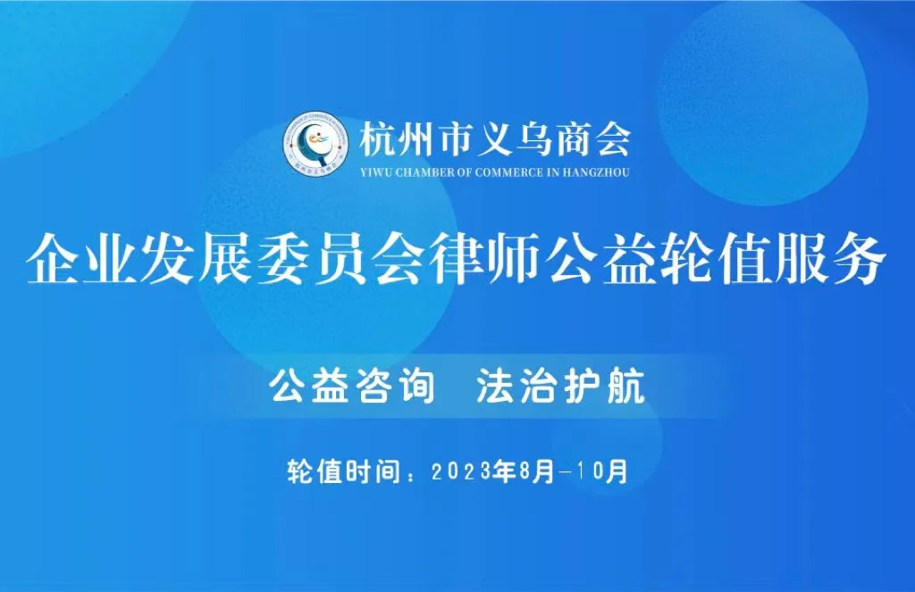 为服务与赋能在杭义乌乡贤,发扬敢为天下先的义乌精神,助力建设世界小商品之都,杭州市义乌商会企业发展委员会推出法治护航系列-法律咨询公益轮值服务,每季度邀请两位在杭义乌籍律师,负责为在杭义乌人提供公益法律咨询。