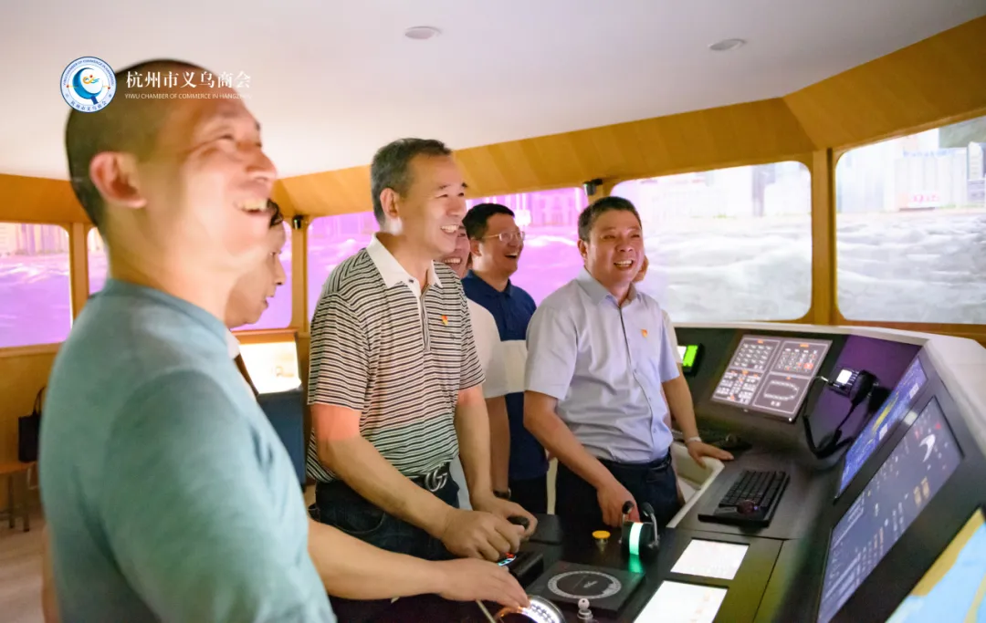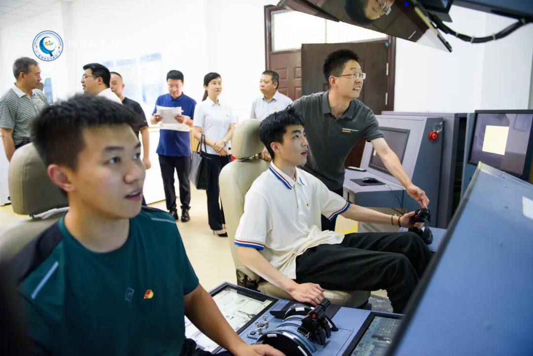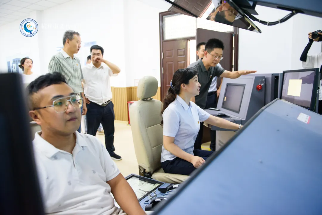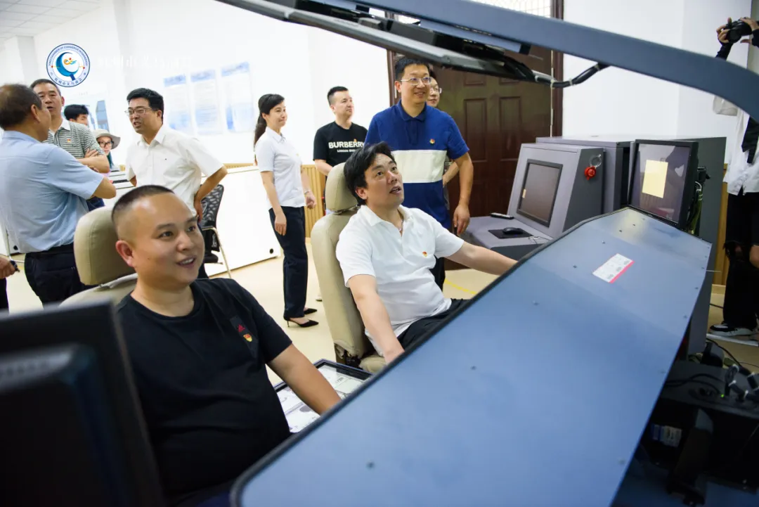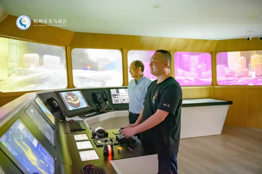 在航海学院的大型船舶操纵模拟器上,参访人员轮流进行模拟轮船驾驶体验,感受掌控大型船舶的紧张氛围和航海技术的多样性。