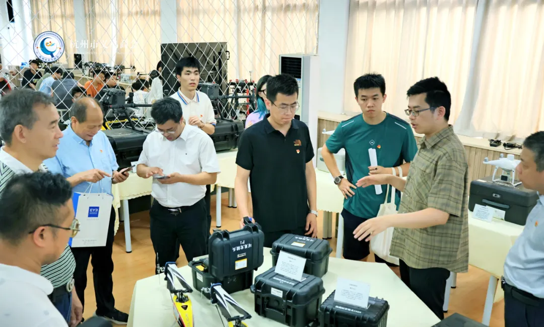 航空学院院长章正伟与专业老师讲解无人机产业、飞机发动机的有关情况。