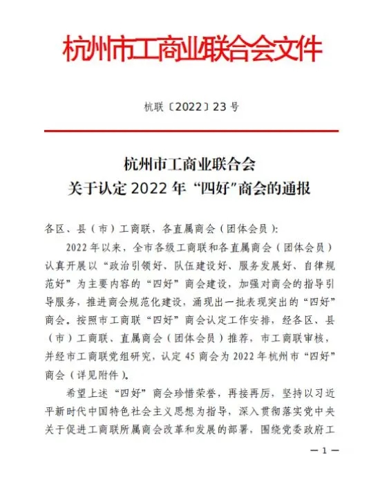 近日,杭州市工商联发布了《关于认定 2022 年“四好”商会的通报》,杭州市义乌商会光荣上榜,获评2022年杭州市“四好”商会。