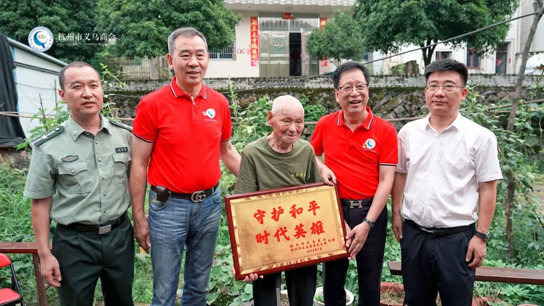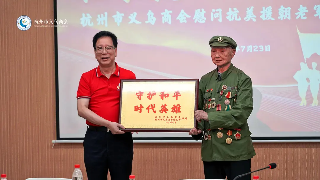 杭州市义乌商会会长陈晓锋为抗美援朝老兵代表朱光同志敬赠慰问牌匾,向守护和平的时代英雄致敬!
