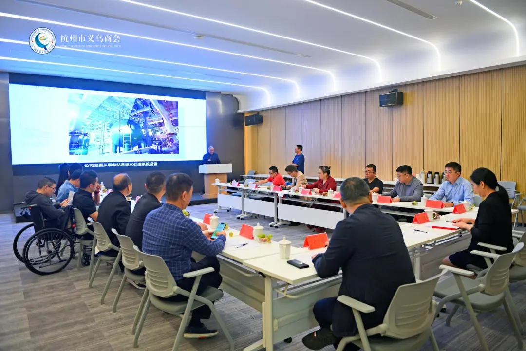 在会议室,力源科技与杭州市义乌商会参访团举行氢燃料电池商业化座谈交流会。