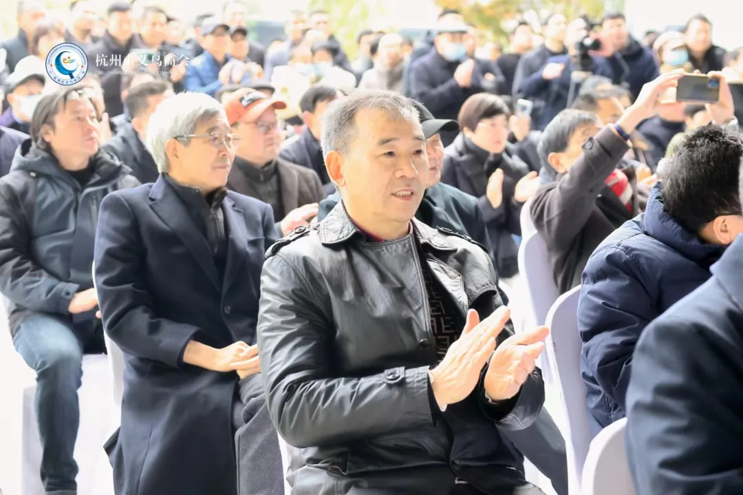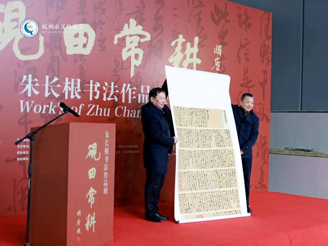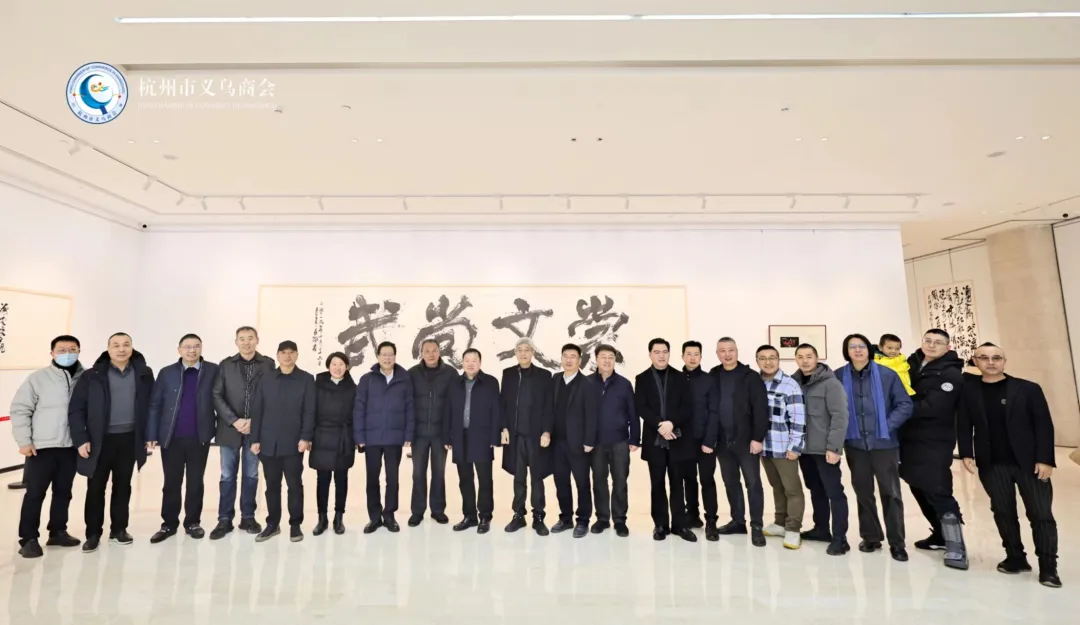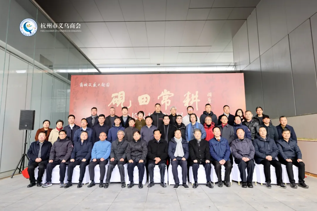 一展迎春,2023年12月17日,杭州市义乌商会名誉会长童四鹤、会长陈晓锋、轮值会长吕世良带队参加“砚田常耕--朱长根书法作品展”开幕式。