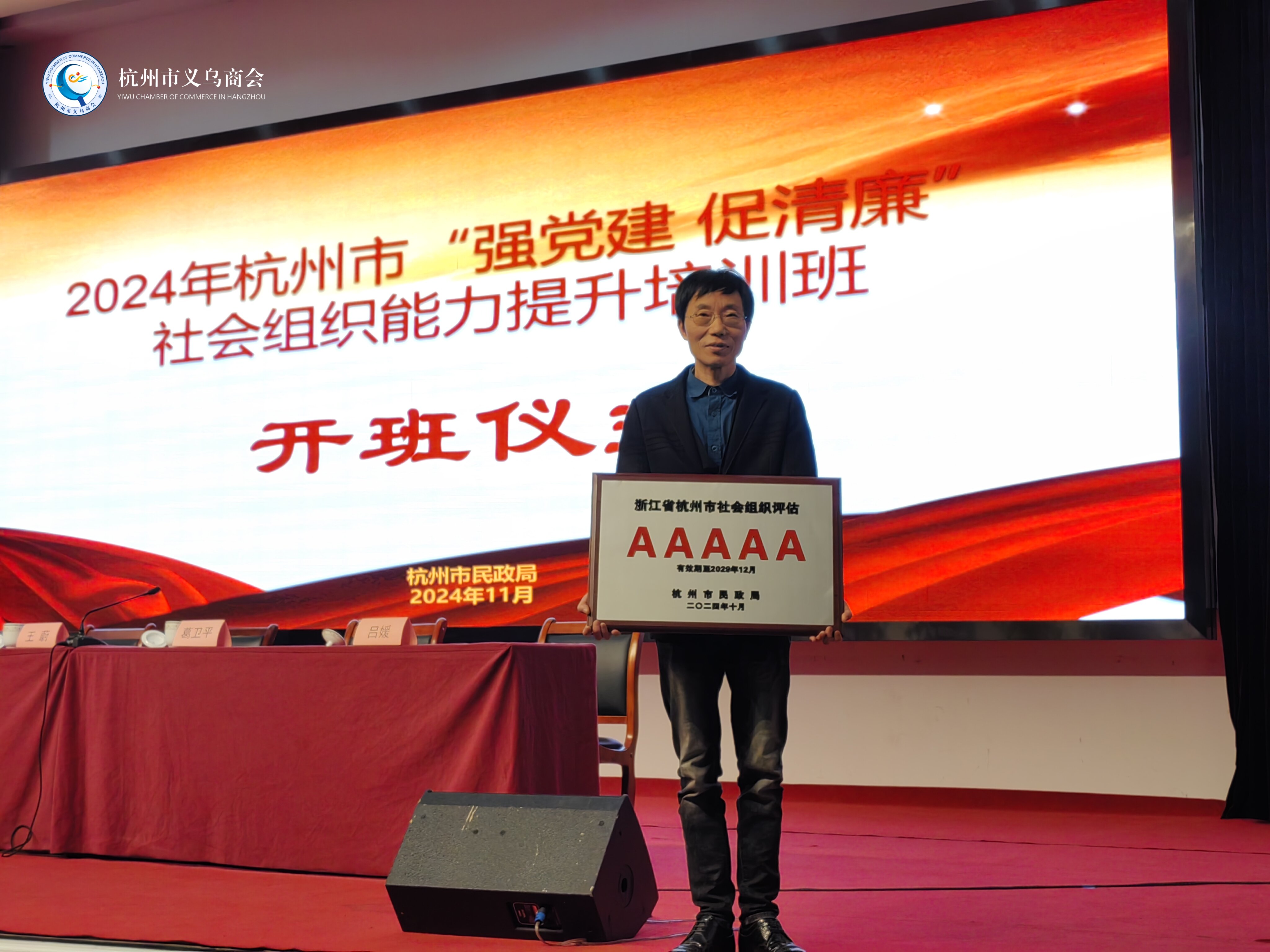 喜报再传,更上一层楼!2024年11月27日,在杭州市社会组织能力提升培训班上,杭州市民政局举行授匾仪式,杭州市义乌商会喜获社会组织最高等级“5A级社会组织”称号。这是商会被认定为浙江省“四好”商会、杭州市“四好”商会之后的又一殊荣。商会轮值会长赵志菲代表商会参加仪式。