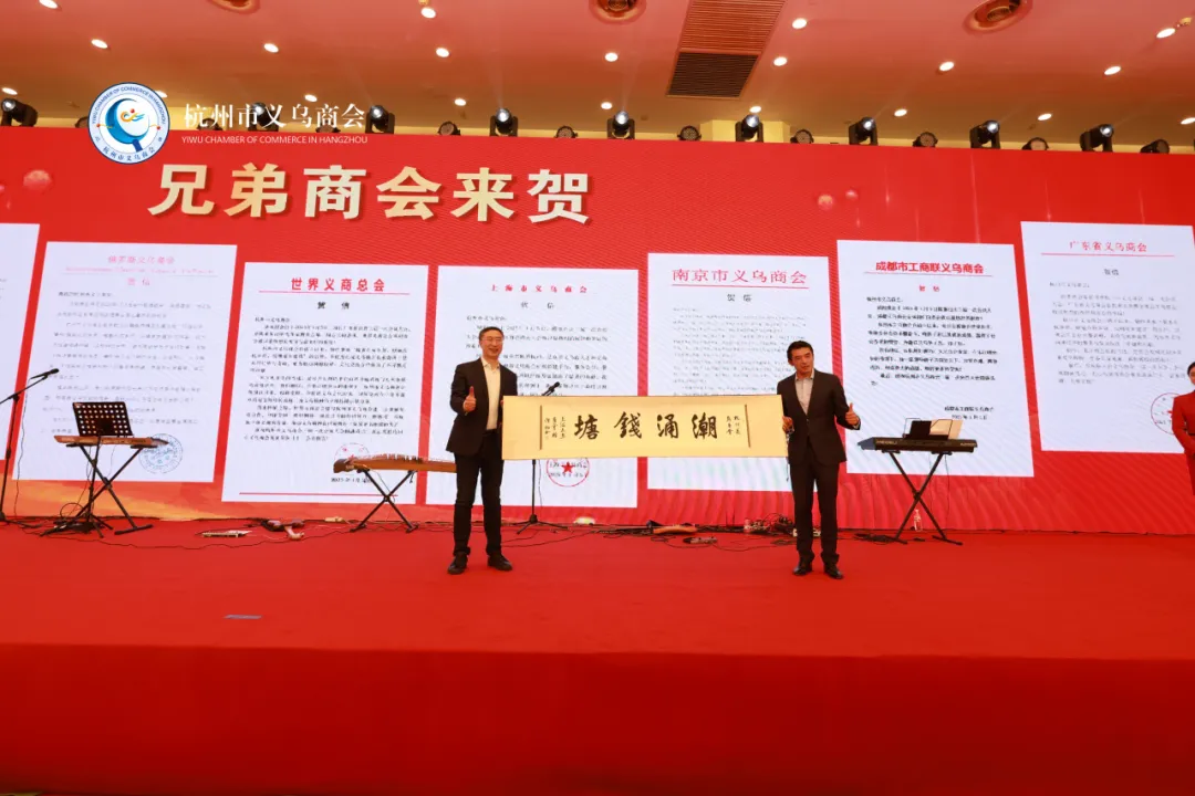 上海市义乌商会会长王旭阳与杭州市义乌商会会长朱江明交接贺礼。